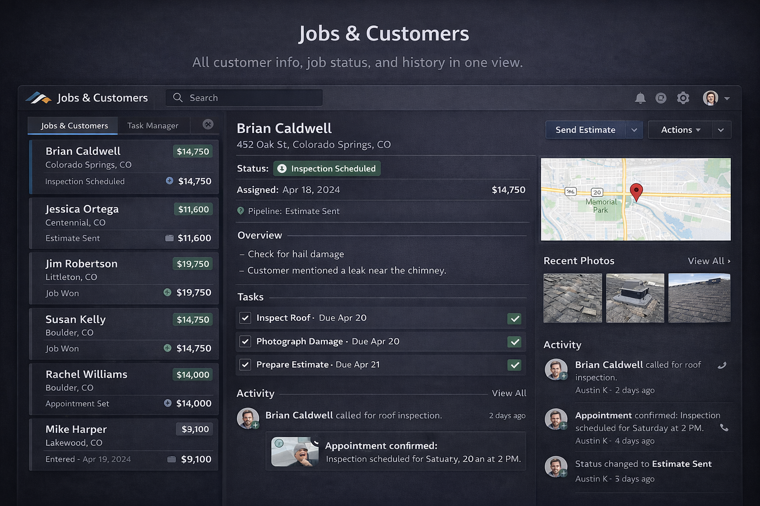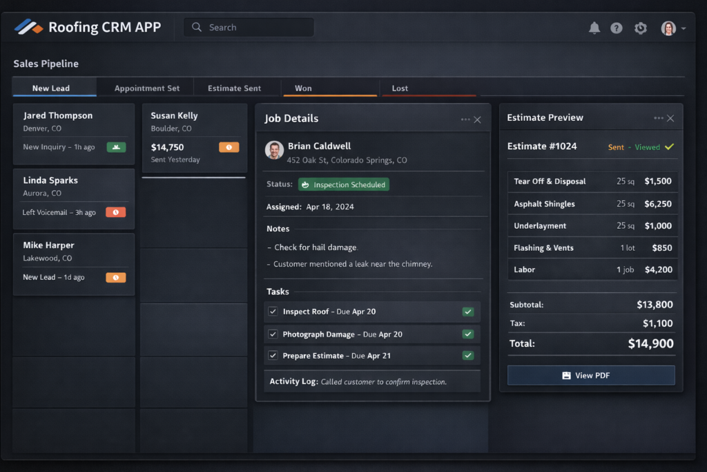 Designed for how roofers track leads, send estimates, and manage jobs.
