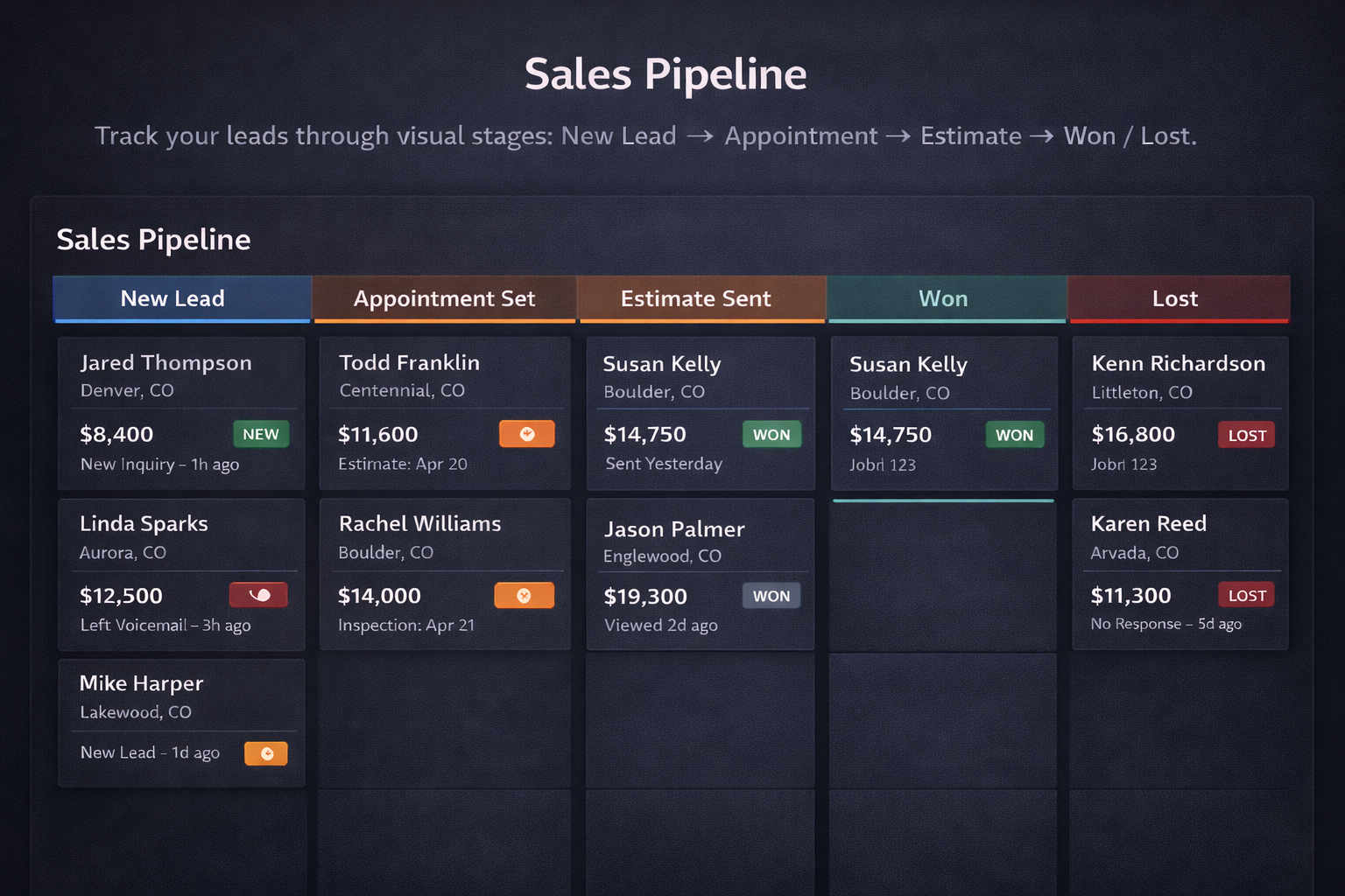 Track every lead, job, and estimate from one dashboard.